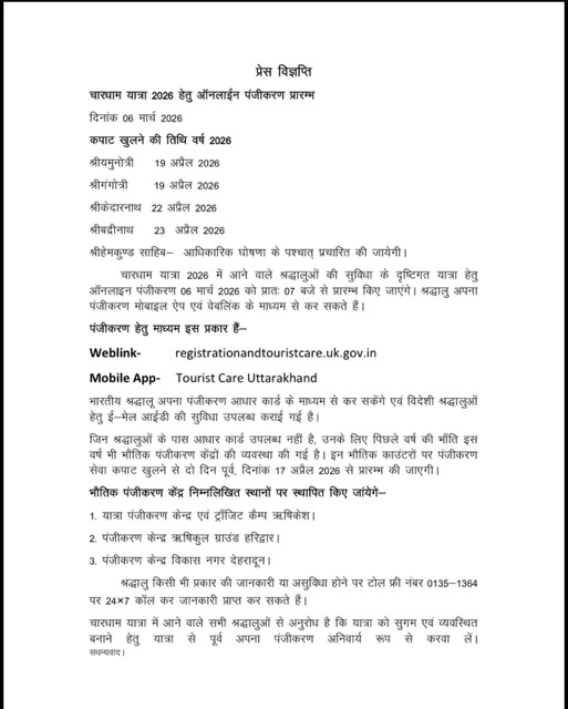चारधाम यात्रा 2026: ऑनलाइन पंजीकरण आज से शुरू, 17 अप्रैल से ऑफलाइन रजिस्ट्रेशन की सुविधा