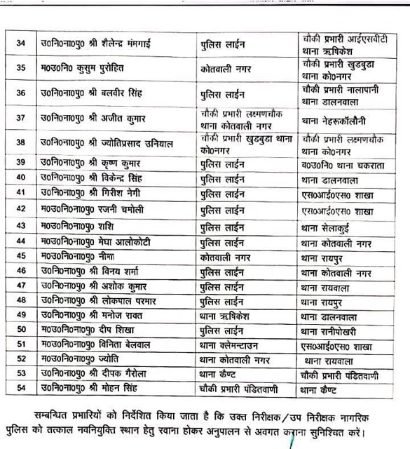 चौकी प्रभारियों के स्तर पर भी बड़ी संख्या में बदलाव किए गए हैं। आईएसबीटी, सभावाला, लालतप्पड़, मालदेवता, जाखन, आईटी पार्क, लख्खीबाग, जोगीवाला, बाईपास और पंडितवाड़ी जैसी महत्वपूर्ण चौकियों में नए अधिकारियों की तैनाती की गई है।